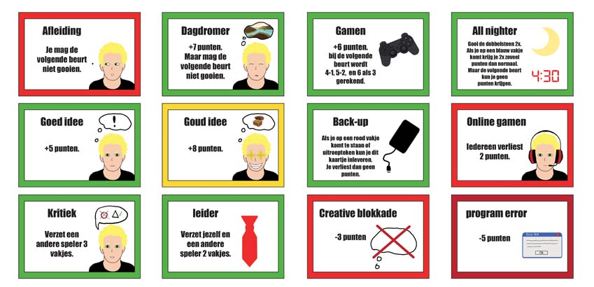 After testing this idea a few times I decided to add cards to the game. When you stand on a question mark you can pick a card these cards have most of the time a good effect but can sometimes have a bad effect. This represents that you sometimes have to take risks to get good ideas.