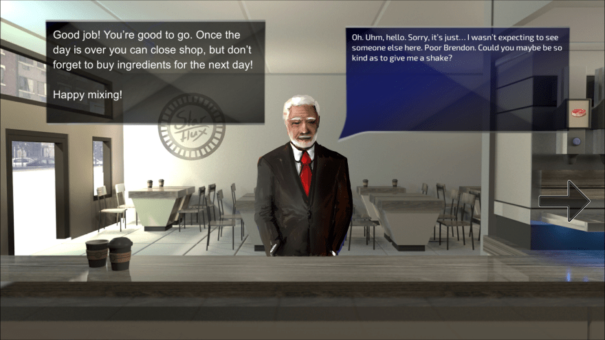 Star Flux is a 2D RPG game set in the distant future. In this future people don’t have enough resources for everyone only the rich people can afford to eat normal food. The other people however have to rely on Star Shakes a daily shake that should have the necessary vitamins to keep a person alive. It is your job as a new employee of star flux to keep the customers healthy by mixing the right ingredients in the shakes. This game was made for the company Transmango to let people see what would happen if we keep wasting our food.